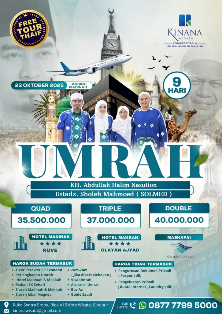 Alhamdulillah bisa umrah bareng Pak KH. Abdullah Halim Nasution bersama Kinana wisata, Alhmdulillah bisa umrah bareng istri juga, kinana wisata mantap, seru ajah umrah bareng kinana wisata, kebersamaannya terjaga, pelayananya juga ramah cekatan, gercep... semoga bisa umrah lagi bareng kinana wisata.